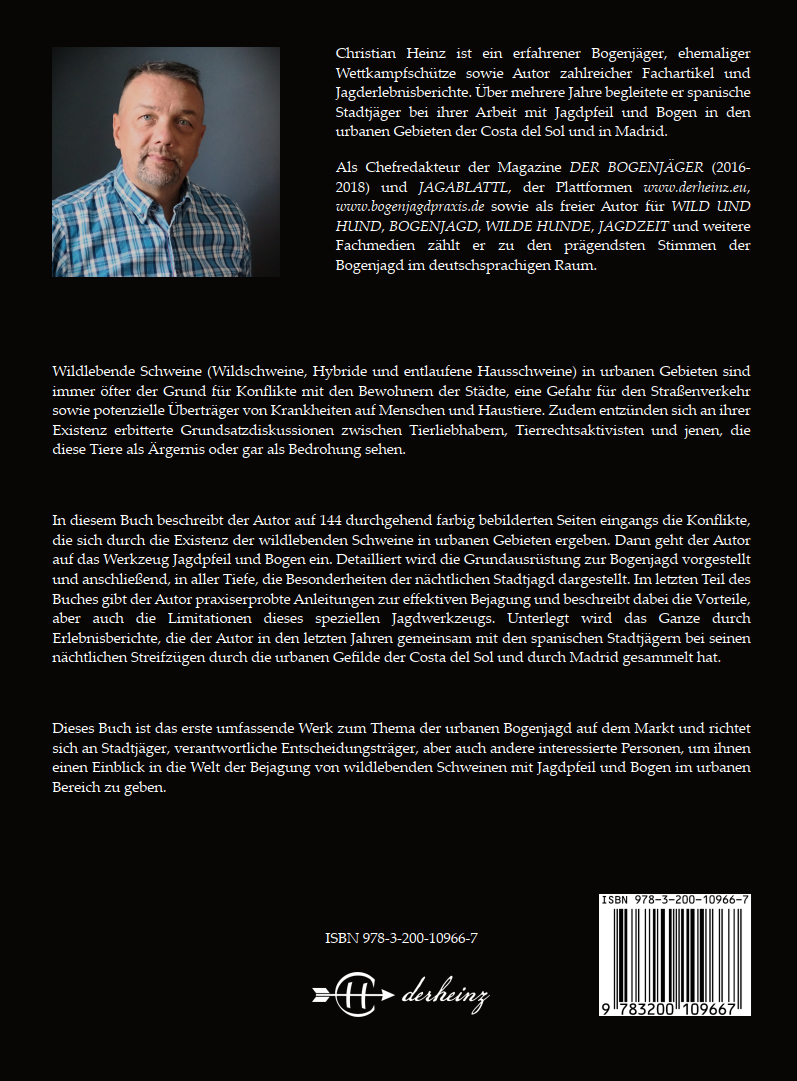 Das im Eigenverlag erschienene Fachbuch von Christian Heinz ist das erste Werk auf dem Markt, dass sich ausschließlich mit der Praxis der Bejagung von wildlebenden Schweinen (Wildschweine, entlaufene Hausschweine und Hybride) im urbanen Raum beschäftigt. Unterteilt in mehrere Abschnitte behandelt das Buch zuerst die Problematik von wildlebenden Schweinen in urbanen Räumen und darauffolgend die Organisationen, welche mit der Bejagung betraut sind. Ein großer Abschnitt behandelt die Ausrüstung im Detail mit darauffolgenden Strategien der Bejagung aus der Praxis, aufgelockert und „gewürzt“ durch viele Erlebnisberichte.