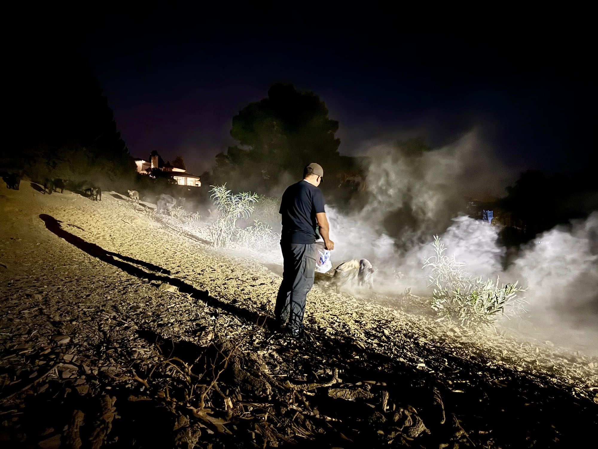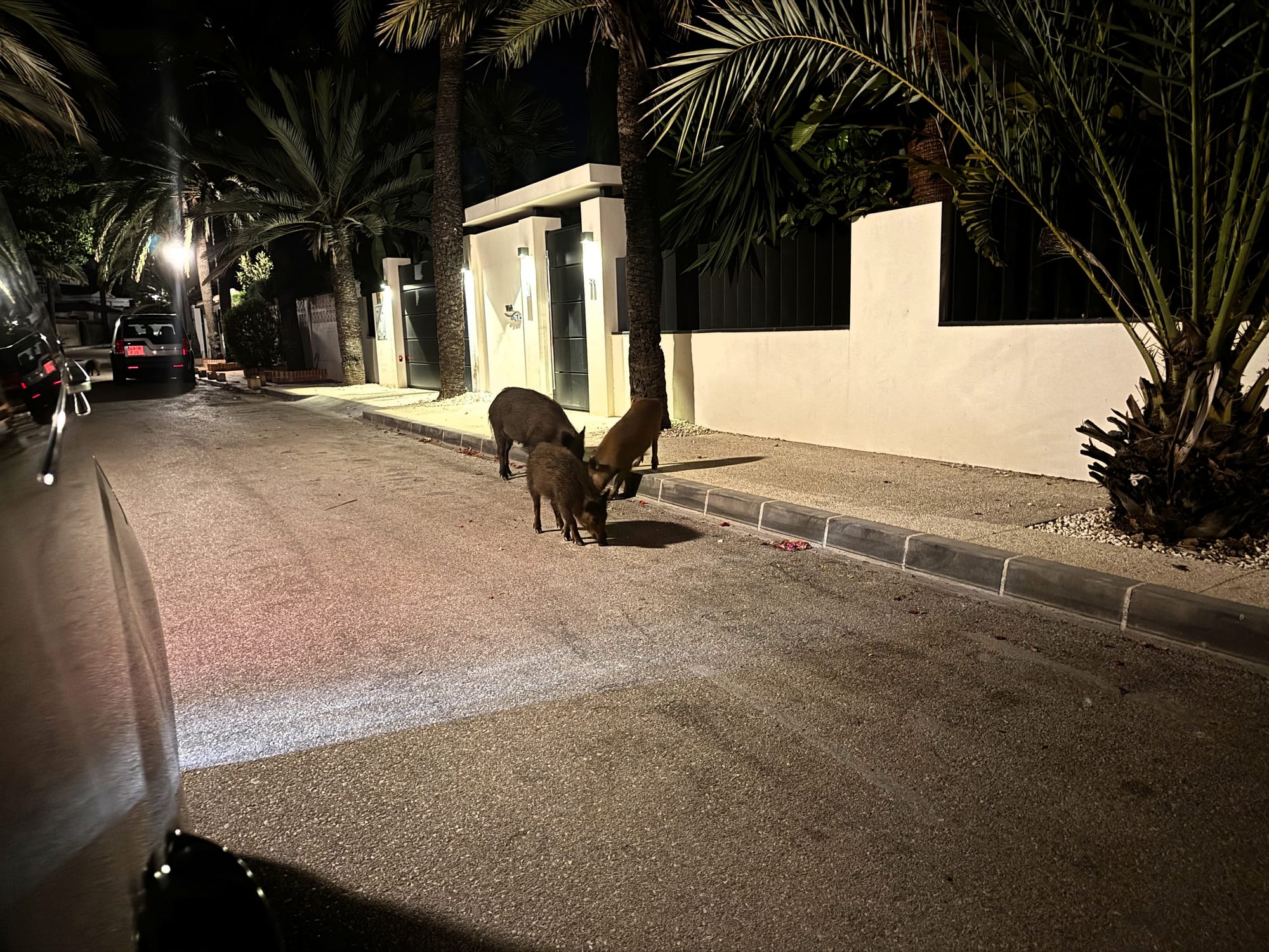 Während einem meiner Besuche im Herbst 2025 patrouillierte ich gemeinsam mit Daniel, Diego und Cecilio in einem Abschnitt mit vielen Villenvierteln entlang der Küste. Wir fuhren alle bekannten Hotspots wie Mülltonnen, Parkanlagen, Strände und Gebüsche neben den Straßen ab aber wir konnten keine Spur der wildlebenden Schweine entdecken. Daniel war der Meinung, sie seien möglicherweise ins Hinterland gewechselt. Doch dann bekam er einen Anruf vom Präsidenten einer Hausbesitzervereinigung eines dieser Villenviertel. Er war verzweifelt, da es in ihrem Viertel, welches auf einem Hügel gelegen war, zu einer ungewöhnlichen Konzentration von wildlebenden Schweinen kam, und das bereits seit mehreren Monaten. Es wurden immer mehr.