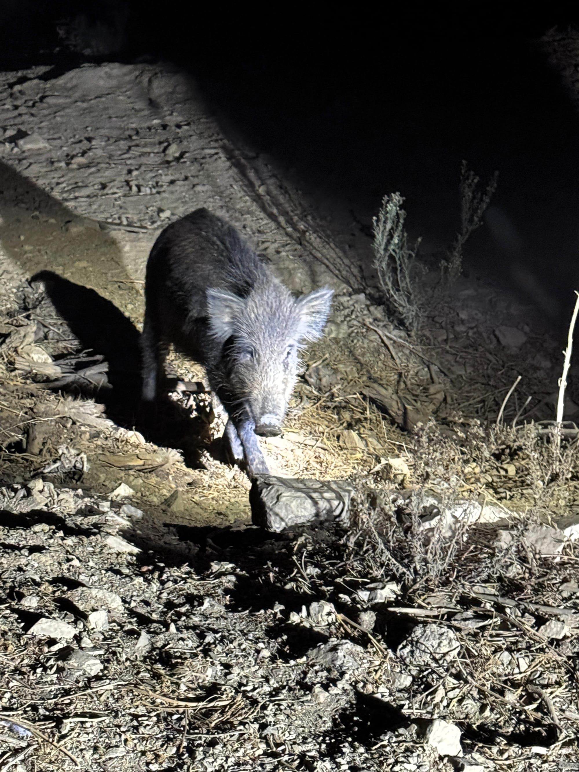 Zur späten Nachtstunde, wir hofften, dass nun alle Anrainer in ihren Betten waren, schritten wir zur Tat. Die Autos wurden wieder auf die Anhöhe über der Senke gefahren, Cecilio holte die Plastiktüte mit dem Mais aus dem Wagen und raschelte lautstark damit. Als ob die Essensglocke geläutet hätte, kamen einige der jüngeren Tiere (Frischlinge und Überläufer) angelaufen, hielten aber anfangs noch einen Sicherheitsabstand. Zwei der Halbwüchsigen (Überläufer) kämpften direkt vor Cecilio und wirbelten dabei jede Menge Staub auf. Diego hatte seinen Bogen bereits mehrfach aufgezogen, musste aber immer wieder absetzen, da die anvisierten Schweine entweder zu eng beieinander standen, sich bewegten oder der Schusswinkel nicht optimal war. Nach etwa 15 Minuten passte es dann, die Bogenlampe leuchtete kurz auf, dann erklang der dumpfe Schlag der vorschnellenden Sehne.