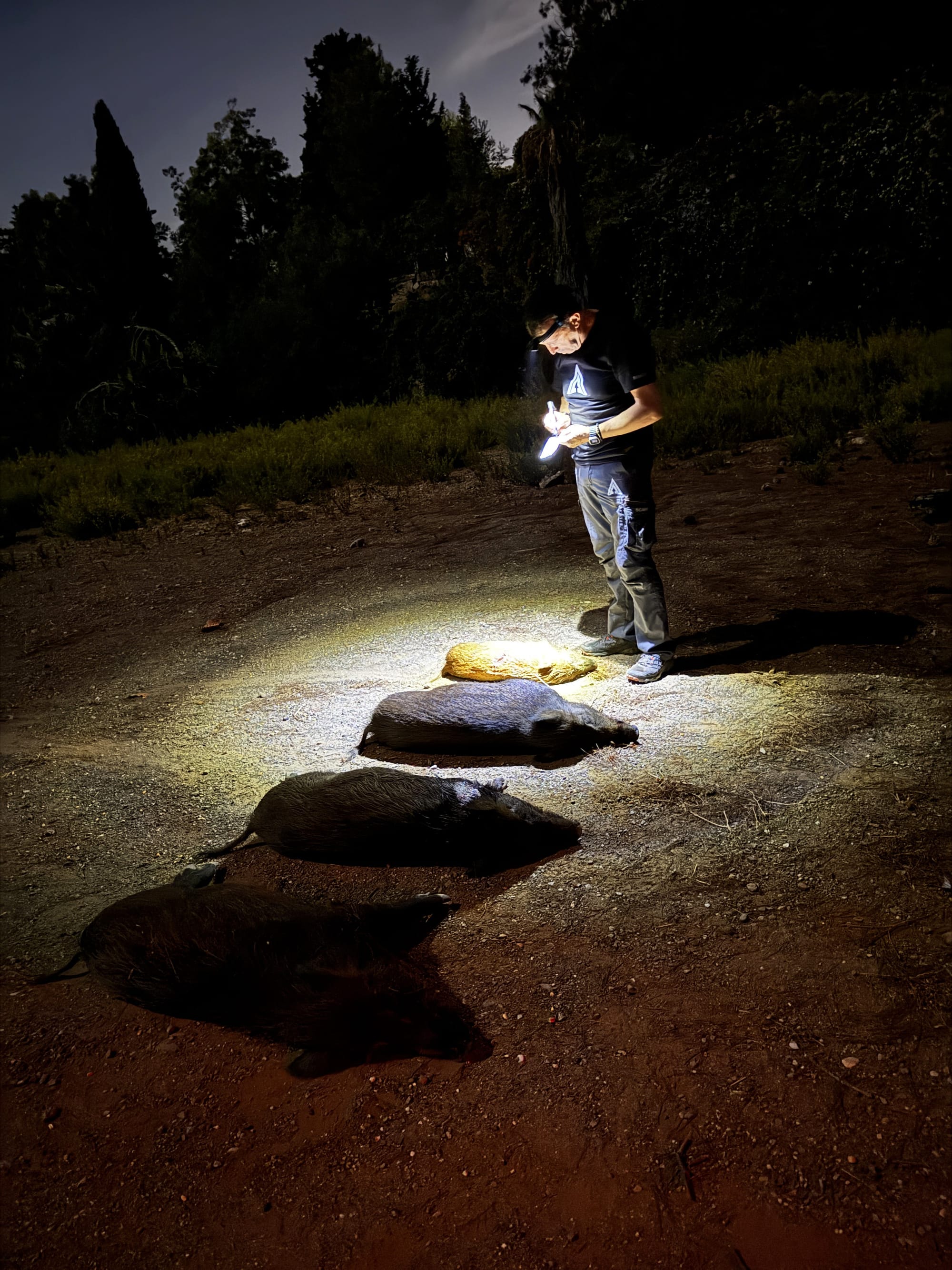 Nachdem die Dunkelheit hereingebrochen war, fuhren wir mit dem Wachmann zu dieser Stelle. Als ich vom Wagen ausstieg, verschlug es mir beinahe den Atem, so stark war der penetrante Geruch der Schweine. Von einer kleinen Anhöhe aus blickten wir in die Senke, 40 Meter vor uns, und ich konnte meinen Augen kaum trauen. Eine unfassbare Anzahl an Schweinen sammelte sich dort. Das Wärmebildgerät zeigte nur noch rot.